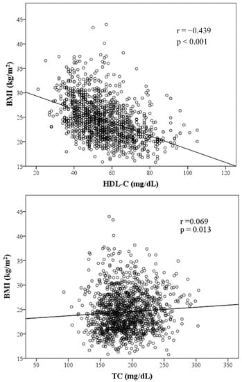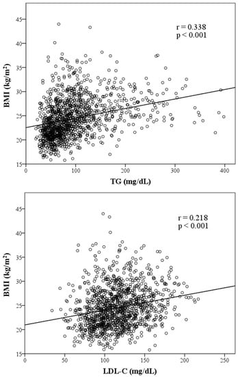 Figure 1 presents graphs illustrating the association between BMI and variables of lipid components. TC, TG, LDL-C and AIP are positively correlated to BMI, whereas HDL-C is inversely correlated to BMI. HDL-C, TG, LDL-C and AIP were significantly associated with BMI. Among those factors with a positive slope, AIP exhibited the strongest association with BMI with a coefficient of 0.462 (p < 0.001).