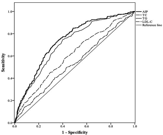 Area under curve (AUC) values of receiver operating characteristic curves (ROC curve) were calculated to compare the predictive value between AIP and three lipid components (TC, TG, and LDL-C) for predicting obesity.
