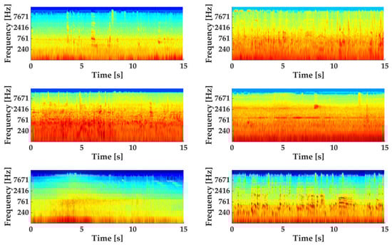 In order to standardise the length of recordings used in this study and expand the number of available recordings, the original recordings were split into 15-s chunks, resulting in 2890 recordings. This operation was performed using the pydub package (v0.25.1) in Python [35] where the full WAV file is loaded in, then 15-s chunks are extracted starting from the beginning of the recording (i.e., a 47-s-long original recording would result in three 15-s recordings, with the remainder 2 s discarded) and exported as MP3 files to be uploaded to the online survey platform. Some examples of Log spectrograms for the stimuli used in the experiment are shown in Figure 1. While it was not possible to control for the absolute sound pressure levels presented to participants in the online listening task, the relative loudness between the sound sources present across the pool of audio samples can be considered faithful to a typical acoustic environment experienced on-site.