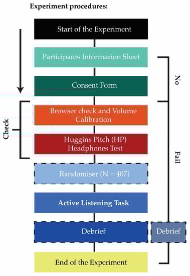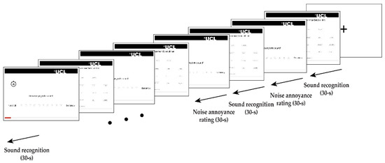 Since the accuracy of sound recognition and noise annoyance rating was the core target of the experiment, every effort was made so that participants qualified for the study and their equipment could deliver the sound stimuli properly. Hence, the online experiment was designed to minimize possible study biases and environmental confounders (Figure 2).