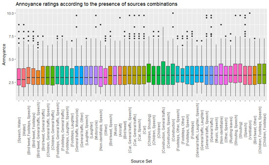 Subsequently, instead of exploring all possible combinations of sound sources (which would be impractical), an approach based on “association rule learning” was used; this is a machine learning method derived from the marketing and product fields for analysing how products tend to appear together in purchase datasets [39]. In the context of this study this was aimed at identifying sets of sounds sources that are more likely to appear together in any labelled recording. However, when looking at the effect of being exposed to acoustic environments with specific sound sources recurring together on noise annoyance, no meaningful differences could be observed. This can be clearly seen in Figure 4, where the distributions of noise annoyance scores are plotted for different groups of recordings with recurring sound sources identified in them. The negative results of these approaches indicated that, contrary to one of the initial primary hypotheses, the particular combination of sound sources which co-occur are not useful for determining annoyance scores for a complex soundscape.