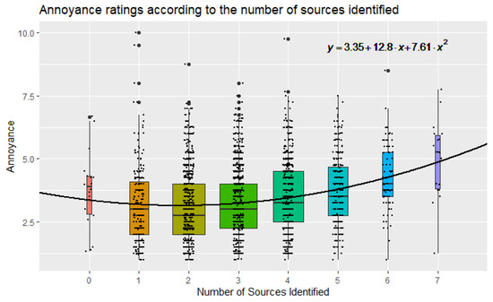 Since the range of number of identified sources (i.e., labels assigned by participants) per recording varied between 0 and 8 in the dataset, the sample was organised into a set of nine mutually exclusive sub-sets with increasing soundscape complexity. When plotting distributions of annoyance scores according to soundscape complexity, as shown in Figure 5, an interesting pattern emerged: mean noise annoyance was minimized for N = 2 sound sources identified, with scores increasing when soundscape complexity was heading towards either N = 0 or N = 8 sound sources identified (however, the N = 8 sound sources group only included two datapoints, and was therefore removed from Figure 5 for clarity; the mean annoyance scores for those is M = 5.0). A one-way ANOVA was then conducted to determine if the noise annoyance was significantly affected by the soundscape complexity dimension. The Annoyance score was statistically significantly different between different groups, F(8, 2881) = 15.354, p < 0.001. Post hoc tests (Bonferroni) revealed that such outcome was mostly driven by differences between the N = 2 sources group and the N = 4, 5, 6, 7 sources groups, which can be observed again in Figure 5. A second-degree polynomial regression was fit to indicate the relationship between the number of sound sources (i.e., soundscape complexity) to the reported annoyance scores, and is shown in Figure 5.