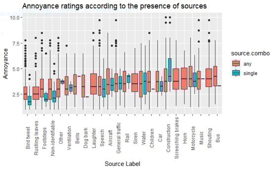 As an additional layer of analysis, it was decided to look at the presence of specific sound sources as a possible factor of influence on the perceived noise annoyance assessed by participants. Distributions of mean annoyance scores as a function of whether a source was identified in a recording, either on its own or in combination with any other source, were plotted, as shown in Figure 6. It can be clearly seen that there is some variety across sources, with the presence of traffic-related sources being generally associated with higher annoyance scores, as opposed to nature-related and backgrounded sound sources, where annoyance is lower.