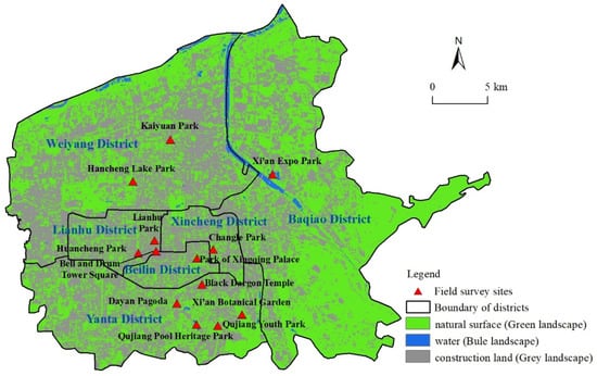 Xi’an is in the warm temperate zone with a semi-humid continental monsoon climate, with annual average temperature of 13.1–14.3 °C and precipitation of 528.3–716.5 mm. High temperature is one of the major meteorological concerns in Xi’an; in 2019, the city’s national meteorological station monitored high temperature ≥35 °C 147 times in 34 days. In this paper, based on the Landsat 8 image of 13 August 2019, the land surface was divided into 3 kinds of landscapes (natural surface (green), water (blue), and construction land (grey)) by decision tree classification, which has a different mechanism for the formation of urban thermal environment. Meanwhile, residents’ perceptions were obtained through questionnaires from 13 field survey sites, as shown in Figure 1.