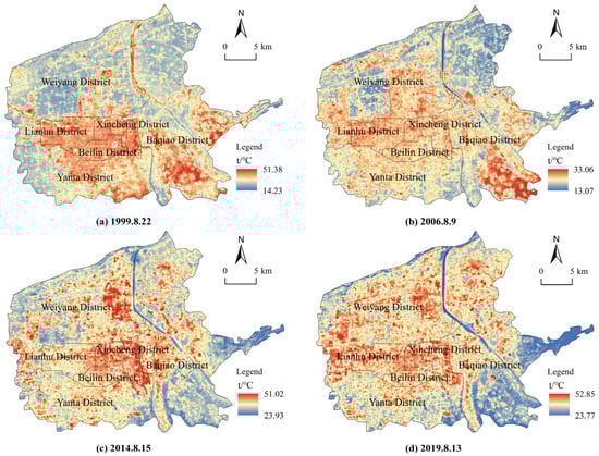 The LST in the six districts in Xi’an City showed significant spatial differentiation, and the high temperature area expanded northward from 1999 to 2019 (Figure 2). Specifically, on 22 August 1999, LST varied from 14.23 to 51.3 °C, with an average temperature of 30.98 °C, and the regions constructed earlier (Lianhu, Xincheng, and Beilin Districts) had higher LST. On 9 August 2006, the average LST was 23.10 °C, with extremely high temperatures in the south of Baqiao District. It is worth noting that urban construction in Weiyang and Yanta Districts accelerated significantly from 1999 to 2006, resulting in an expansion of the high temperature range. LST ranged from 23.93 to 51.02 °C and showed an average value of 33.41 °C on 15 August 2014. The UHI effect in Lianhu and Beilin Districts was reduced, and the area with extreme high temperature migrated to the east of Weiyang District. The average LST was the highest (36.66 °C) and the UHI effect was widespread on 13 August 2019. Low LST values were concentrated in urban water bodies such as the Chanhe and Bahe Rivers and the undeveloped region in the east of Baqiao District.