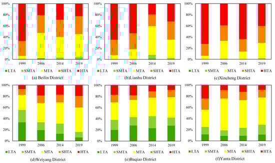 Figure 3 depicts the proportions of LST grades in the 6 districts during different periods. It can be found that the range of UHI of Beilin, Lianhu, and Xincheng Districts, which were developed earlier in the last 20 years, was significantly larger than in the other three districts. The proportion of UHI area was mostly over 50%, whereas the LTA area was less than 1%. With the outward-oriented expansion of urban construction, as well as the promulgation of the “Green space system planning of Xi’an City (2004–2020)”, the functions of the urban center have been loosened, and green infrastructure construction has been continuously strengthened. In this context, the UHI effect in Beilin, Lianhu and Xincheng Districts has been mitigated significantly and gradually transformed into MTA from 1999 to 2019. On the contrary, since the implementation of the Hundred Villages Reform to City plan in 2007, Weiyang District, located in the north of the study area, has gradually transformed from a northern suburb into a new center. However, accompanying urban thermal environment risks also became apparent. The proportion of UHI area in this district increased from 17.64 to 40.18% over the past 20 years. In contrast, the range of UHI in Yanta and Baqiao Districts decreased steadily, but the threat of continuous transfer from LTA to HTA remained.