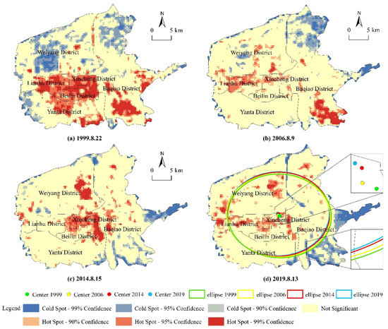 In this paper, hot–cold spot analysis, standard deviation ellipse, and gravity center were comprehensively applied to clarify the spatial migration of UHI in Xi’an City. Considering the resolution difference of the thermal infrared band among different sensors, the study area was divided into 360 m resolution grids, and the average LST of each grid was extracted. The standard deviation ellipse and the gravity center can effectively reflect the overall structure of geographic elements, and represent the directionality of data distribution [36]. The hot–cold spot analysis divided the samples into seven grades based on the Getis-Ord Gi* index to test whether there is a significant clustering phenomenon of high or low values: extremely cold spot (cold spot at 99% confidence), cold spot (cold spot at 95% confidence), relatively cold spot (cold spot at 90% confidence), insignificant spot, relatively hot spot (hot spot at 90% confidence), hot spot (hot spot at 95% confidence), and extremely hot spot (hot spot at 99% confidence) [37].