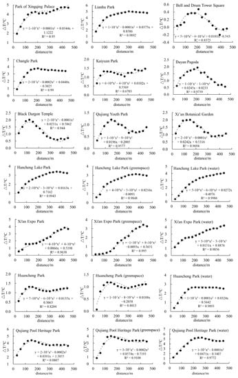 Figure 5 shows the variation of ΔT in multi-buffers of urban parks, demonstrating that the cubic polynomial can well reflect the significant cooling effect of parks on their surroundings, and the diverse shapes of fitting curves indicate that the cooling intensity and amplitude of urban parks differ significantly. Among them, Lianhu Park, Changle Park, Hancheng Lake Park, Hancheng Lake Park (green space), Huancheng Park (water), and Qujiang Pool Heritage Park (water) had similar fitting curves, with ΔT rising rapidly at a short distance (0–200 m) before dropping slightly beyond 400 m. The ΔT of Xi’an Expo Park and its internal green space and water patches, and Hancheng Lake Park (water) increased steadily with distance. The fitting curves of Kaiyuan Park and Park of Xingqing Palace show frequent fluctuation, with the first temperature inflection points appearing at around 200 m and 100 m, respectively. The ΔT curves of Black Dragon Temple, Qujiang Youth Park, Xi’an Botanical Garden, Huancheng Park, Huancheng Park (green space), Qujiang Pool Heritage Park, and Qujiang Pool Heritage Park (green space) displayed an increase–decrease–increase trend. ΔT often reached its peak within the range of 120–150 m from the park, and dropped rapidly after the first inflection point, the cooling effect of which was obvious, but the operating distance was short. However, the fitting curves of the control samples were significantly different from the others, showing a narrow cooling effect range and no rising trend of ΔT.