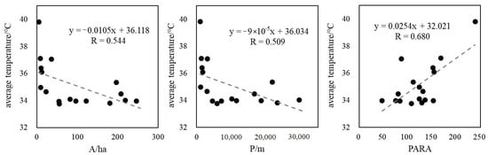 Understanding the relationship between UHI and landscape pattern can provide important support for urban green space system planning. The relationship between average LST and landscape pattern metrics of each park in 2019 was determined in this paper. As explained in Section 3.3, the internal temperature of water is significantly lower than that of green space, which belongs to a special landscape patch in parks. In order to avoid the influence of special samples, four single patches of water were excluded. Figure 6 shows that the average temperature inside urban parks was significantly negatively correlated with landscape area and perimeter (p < 0.05), implying that the cooling effect of parks would be significantly enhanced as the area increased, which is consistent with the results of previous studies [39]. Moreover, the Pearson correlation coefficient revealed that LST was more sensitive to changes in area than perimeter, indicating that expanding the park area would be more effective than increasing the perimeter to reduce UHI. PARA was significantly positively correlated with the average temperature of parks (p < 0.01), indicating that more complex shapes are often accompanied by higher LST, which has been confirmed in many studies [40,41]. In general, expanding the area of urban parks and controlling the complexity of their shape would help to reduce UHI. However, due to differences in land prices, the growth of planned areas of green infrastructure is limited. Hence, more attention should be paid to maximizing the cooling effect by increasing the proportion of water, increasing the vegetation density and optimizing the shape of parks.