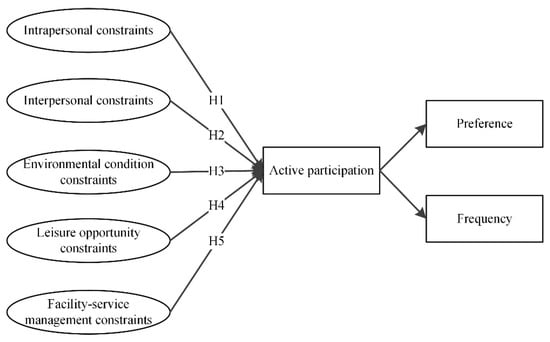 59]. We first proposed an initial theoretical model and posited that all five perceived constraints would influence the individuals’ preferences and frequency of active recreational sport participation. In order to test the multi-variate relationship between the five perceived constraints and active recreational sport participation in leisure time, five hypotheses were stated in the following and are presented in