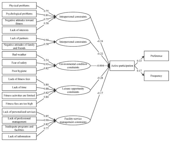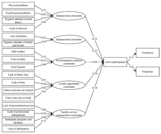 In this study, we followed a two-step modeling procedure for structural equation modeling (SEM) to test the hypothesized measurement model. The 17 measuring perceived constraint scales obtained from PCA were the observed variables in the SEM. Intrapersonal constraints, interpersonal constraints, environmental condition constraints, leisure opportunity constraints, and facility-service management constraints were the latent variables of cause in the SEM. The preference and frequency of active participation were treated as latent variables of SEM.