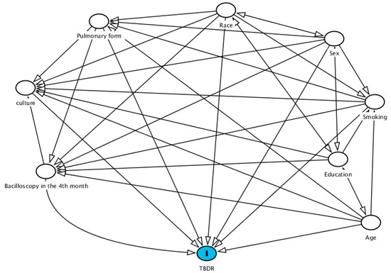 Based on the DAG approach, Figure 1 shows the network of relationships between the variables, and thus, it is possible to identify the different links between them, allowing the assessment of the possibility of positive interventions to control and combat the occurrence of DRTB.