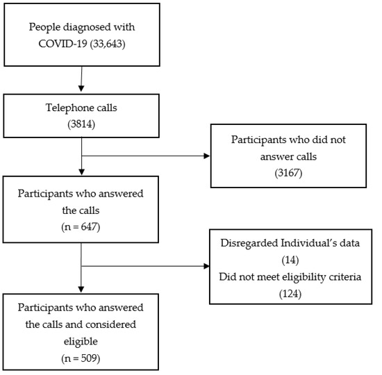 The Municipal Health Department of Ribeirão Preto provided the names, telephone numbers and e-mails of 33,643 people diagnosed with COVID-19. Randomly, using Microsoft Excel®, seven evaluators, trained and supervised by the principal investigator, made 3814 telephone calls. Of this total, after a maximum of three attempts, 647 participants answered the calls. Data from a total of 14 individuals were disregarded, as the participants did not meet the eligibility criteria, and 124 persons did not wish to participate in the study. Thus, 509 people diagnosed with COVID-19 were interviewed and considered eligible (Figure 1).