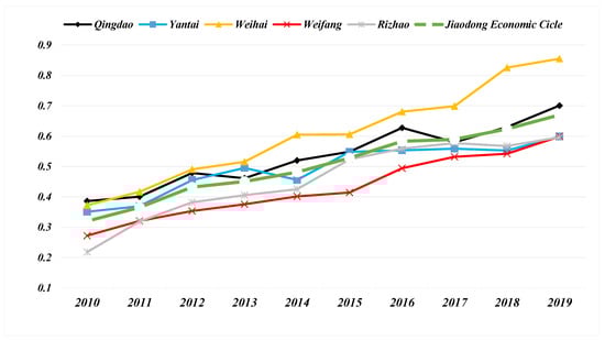 From 2010 to 2019, the CCD development of NTU-UI-UE in the five cities of the Jiaodong Economic Circle show a very stable upward trend (