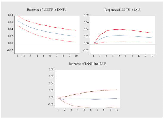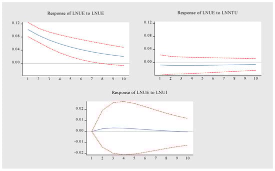 Figure 9 is the LNNTU pulse response diagram. When LNNTU is impacted by itself, it forms a long-term positive effect, reaches the peak in the first period, and then slowly weakens. The impact of LNUI on LNNTU showed a trend of first rising and then stabilizing. From the initial stage to the third stage, the promotion effect was enhanced, and from the fourth stage to the tenth stage, it tended to be stable. LNUI maintained a positive promotion effect on LNNTU. LNUE had a relatively stable inhibitory effect on LNNTU from the second period to the tenth period. To sum up, LNNTU is promoted by itself and LNUI, but LNUE inhibits LNNTU.