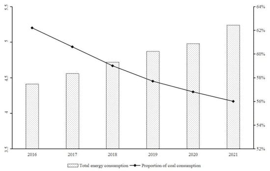 Scale-driven economic growth has led to excessive energy consumption and pollution emissions [,]. Problems, such as over-exploitation of resources, environmental pollution, and abnormal climate, have become huge obstacles to sustainable economic development [,]. According to the statistics released by the National Bureau of Statistics of China, in 2021, China’s total energy consumption was 5.24 billion tons of standard coal, an increase of 5.2% over the previous year (Figure 1). Coal consumption accounted for 56.0% of the total energy consumption. China is still the world’s largest coal consumer and greenhouse gas emitter. According to calculations based on China Emission Accounts and Datasets (CEADs, https://www.ceads.net.cn (accessed on 10 September 2022)), in 2021, China’s total carbon emissions exceeded 10.3 billion tons, accounting for about 27% of the total global carbon emissions, close to the sum of the United States, the European Union, and Japan. The task of achieving carbon neutrality by 2060 is extremely arduous. In recent years, China has rapidly developed green finance with carbon reduction, environmental protection, and sustainable development. According to the statistical data of the People’s Bank of China, by the end of 2021, the balance of China’s green loans was CNY 15.9 trillion, an increase of 33%, ranking first in the world. As an important policy tool of modern environmental governance, green finance not only has the characteristics of market-oriented environmental regulation but also has the function of resource allocation of the financial sector. Promoting the development of green finance can reduce the credit rationing of ‘two high industries’ (high energy-consuming and high-emissions), improve the industrial structure, and accelerate the transformation of production mode to cleaner production [,]. The goal of environmental governance is to change the behavior choice of enterprises. Only when more enterprises take the initiative and are willing to undertake ESG can carbon neutrality be finally achieved.