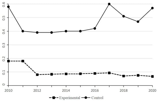 To ensure that the parallel trend hypothesis and the uniqueness of the policy time point are established, this paper conducts two tests: First, test whether the parallel trend hypothesis is established. As shown in Figure 2, by comparing the two data groups, it is confirmed that the experimental and control groups’ development trends before the policy are basically the same, with the same development trend, indicating that the model meets the common trend assumption. Second, only the samples before the start of the policy are retained, and the start time of the policy is assumed to be 3 years (2009) and 4 years (2008), respectively. Since the start time of the policy is “false”, it is expected that the green credit policy will not significantly impact all enterprises’ environmental and social responsibility behaviors. The results are basically in line with expectations; before the policy started, the green credit policy had no significant impact on enterprises’ two corporate ESG behaviors. It is reasonable to take 2012 as the policy time point.