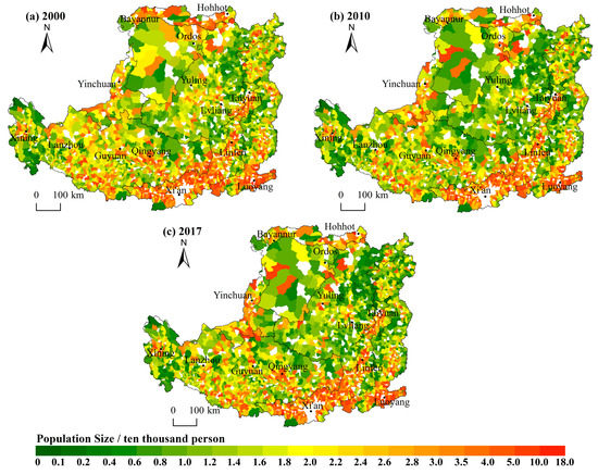 Spatial patterns of population in the Loess Plateau, 2000–2017. The white patches in the picture are the towns where the sub-district and county seats are located.