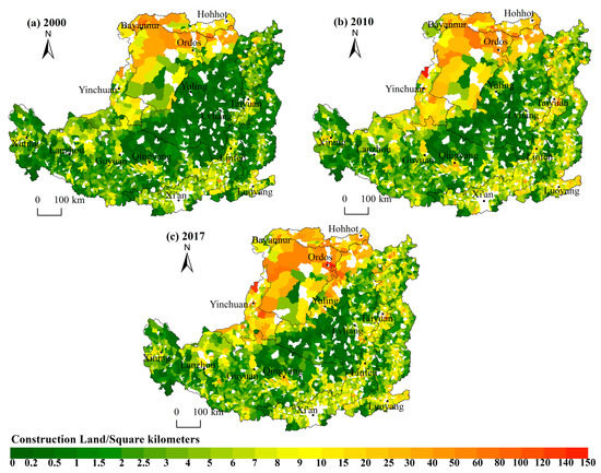 Spatial patterns of construction land in the Loess Plateau, 2000–2017.