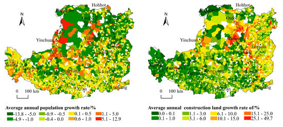 Annual average growth rate of population and construction land in the Loess Plateau, 2000–2017.