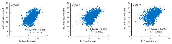 where represents the quantity of construction land of a town at the time ; is the scale coefficient; represents the population size of the town at the time , is the allometric scaling coefficient. Take the logarithm of both sides of Equation (3) at the same time to obtain [43]:
