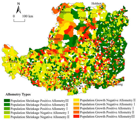 - The allometry type of the zone of the Gullied Loess Plateau is mainly negative allometry which is dominated by Population Growth Negative Allometry II, Population Shrinkage Negative Allometry II, and Population Growth Negative Allometry I, with each type accounting for 55.32, 51.82 and 48.35% of the towns. The population of the East Qinghai area continues to grow and the speed is faster than the growth of construction land because of the large minority population and animal husbandry. Due to the fragile ecological environment in the Middle Gansu, and the South Ningxia areas, these towns are mainly engaged in the agricultural industry; the government reduces the population mechanically through a series of immigration programs. For example, in 2020, the permanent residence rate of Pengyang County was only 65%. The difference between the natural environmental and government policies has led to a large difference in the human–land relationship within this zone.