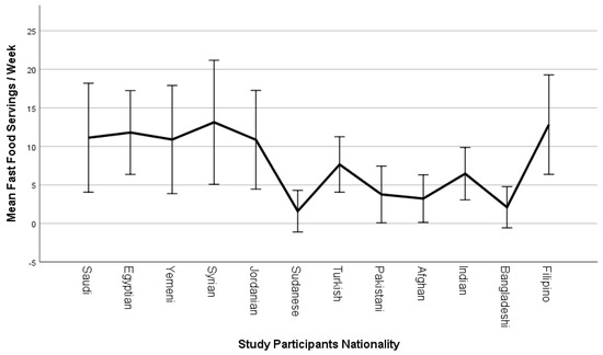 Line chart illustrating the mean number of fast food servings consumed per week among study participants stratified based on their nationality (mean ± SD).