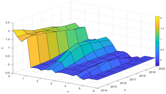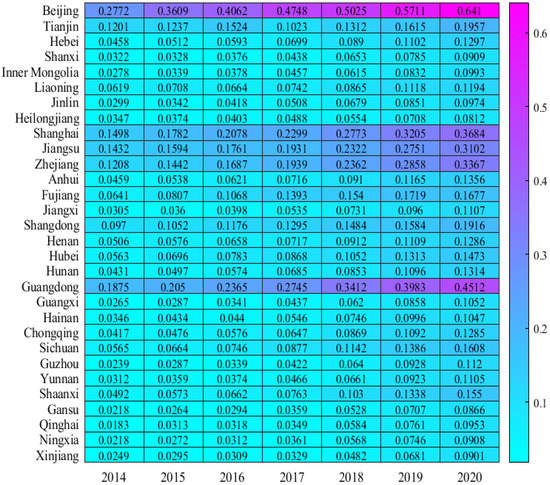 We chose the entropy method for weighting, which can avoid the bias caused by human factors. Since it is aimed at panel data, related improvements are made on the basis of the entropy method, and a time factor is introduced. If there are θ years, indicators, and provinces, denotes index of province in year t, where ; ; .