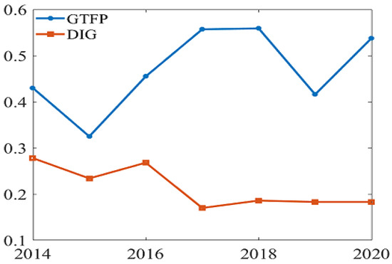 (1) The positive impact of DIG on GTFP gradually diminished over time. Currently, China’s information infrastructure is relatively complete, and the effect of digitalization on GTFP is reflected in the rapid development of consumer Internet and e-commerce. However, digital industrialization and industrial digitization are immature [53]. Compared with digital infrastructure, the digital industry is the driving force behind the continuous improvement of GTFP [54]. Therefore, for regions with better digital infrastructure to continue to promote GTFP, it is necessary to focus on the development of digital industries.