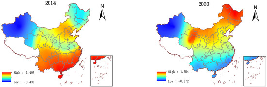 To explore the spatial differences in the impact of digitization on GTFP, the regression coefficients for digitalization in 2014 and 2020 are presented visually in this paper, as shown in Figure 5. Digitization has a significant impact on GTFP. The parameter differences between adjacent provinces are slight. At the beginning of the research period (2014), the places where digitization had a more significant impact on GTFP were mainly concentrated in the southeastern coastal areas. At the end of the study period (2020), it was transferred to northern China.