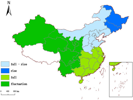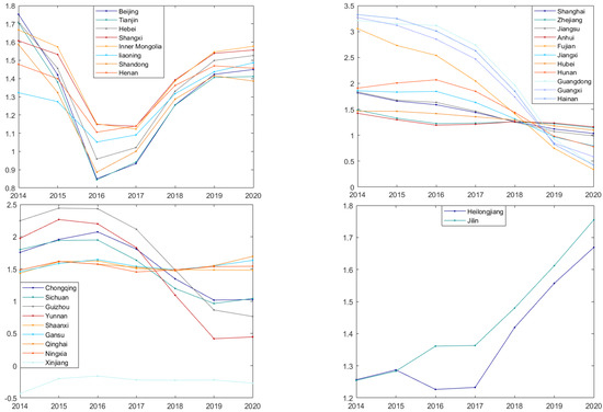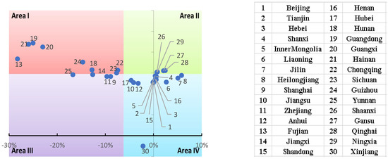 From the point of view of the average annual growth rate, when the points are located in areas I and III, it indicates that the annual average growth rate of the regression coefficient of these provinces is lower than the average level (−6.2%), mainly in Guangdong, Shanghai, Zhejiang, and so on. The points in areas II and IV indicate that the annual average growth rate of the regression coefficients in these provinces is higher than the average level. There are mainly Shaanxi, Qinghai, Beijing, and so on. These regions have contributed to the growth of the national regression coefficient.