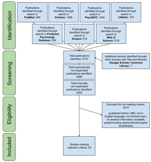 The search yielded a total of 5737 records (Figure 1). After electronically eliminating duplicates, the titles and abstracts of the remaining 3086 records were manually screened for suitability based on the stated inclusion and exclusion criteria. Based on this review, another 36 duplicate publications were identified and, therefore, discarded. Among the remaining records, 3015 were excluded since they did not meet the criteria. A total of 35 publications were eventually included in the scoping review (Table 2).