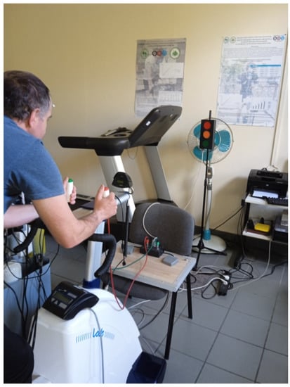 The choice RT was measured using an MCZR/ATB 1.0 m (ATB INFO-ELEKTRO, Zabrze, Poland), validated by Zapała et al. [48]. Measurements were taken immediately before and immediately after the sprint interval testing protocol (after the third/last sets). The reaction time meter consisted of a central control panel connected to a beacon for visual and auditory stimuli together with a stimulus reception panel. The stimulus beacon emits visual stimuli in three colors: red, orange, green, and auditory stimuli in two sounds: high (treble) and low (bass). The stimulus reception panel consisted of two hand-held buttons (one right and one left) placed on cables terminated with a JACK-type plug. During the measurement, the participant sat on the cycle-ergometer with hands on the handlebars and simultaneously held push-button plugs in their hands. The participant was positioned facing the stimulus beacon at a distance of 3 m. Figure 1 shows the position that the cyclists took during the reaction time measurement. The participants were asked to react as quickly as possible by pressing a button with their right hand after a red light appeared and with their left hand after a green light appeared. Intentionally, the button in the right hand was red, while the one in the left hand was green. The participants did not have to react to the remaining stimuli: orange light and sounds. Each cyclist had a test measurement for familiarization, which lasted 40 s and consisted of 10 stimuli, and was performed only once (on the day the cyclists performed an incremental test). In contrast, the main measurement lasted 120 s and included 20 stimuli arranged in a specific order and occurring at a specific time. The choice RT measurement was applied to all participants, before and immediately after the sprint interval testing protocol and before and after the experiment. The measurement evaluated the average choice RT (time calculated from all reactions), the minimal choice RT (shortest reaction), the maximal choice RT (longest reaction), and the number of incorrect reactions (no reaction when supposed to react, reaction when not supposed to react, reaction with the wrong button, reaction between stimuli).