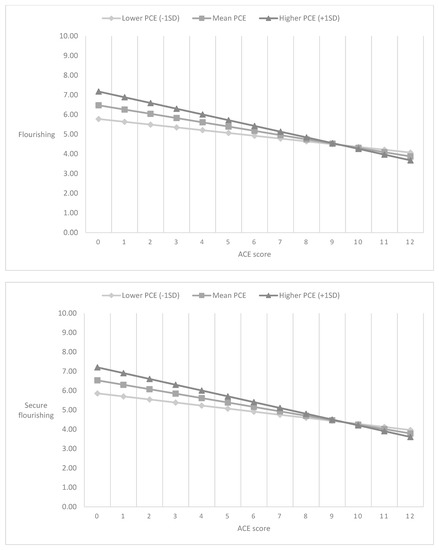 3.4. PCEs Moderates ACEs’ Influences on Adult Flourishing