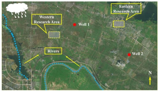 The study area was gridded into a total of 44908 horizontal grids and a discrete vertical grid of 3 layers, with a dimension of 4356 m (x) × 2058 m (y) × 10 m (z). The limestone in the study area was defined in the north as a zero-flow boundary, while the average water levels of the river in the southeastern and southwestern parts were represented by a fixed-head boundary. The two main sedimentary layers, namely the upper and lower layers, were considered to be unconstrained and constrained, respectively, in the model. In addition, the riverbed in the study area was defined as a drainage ditch since it can be occasionally filled with groundwater. Two production wells in the study area were included with constant flows of 50 and 300 m3/d.
