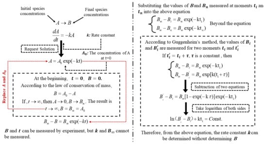 Meanwhile, the adsorption and decay rates of TP in the groundwater environment use first-order irreversible kinetic reactions. Serguei A. Bobrovnik [] developed a method for solving the rate constants and total end products in the first-order irreversible kinetic rate reaction equations based on the analytical solution of the transcendental system of the equations for the reaction kinetics in special cases. Suppose the initial species is A and the final to product is B. According to the Guggenheim method, the concentration of species B is measured at ti and tn moments and substituted to calculate the kinetic rate reaction constant. In the case of uncertainty of the B concentration, the rate constant k is determined. The derivation is shown in Figure 2.