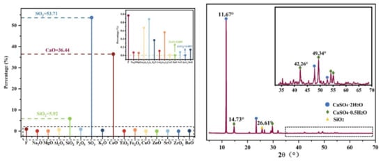 The physicochemical properties of PG have an important influence on the results of the properties of the backfilling bodies and the leaching toxicity tests. First, XRD and XRF experiments were used to detect the basic composition of PG, and also to provide a reference basis for the leaching toxicity experiments. By analyzing the particle size composition of PG, the particle size distribution of PG is determined, which provides a basis for the proportioning of backfilling experiments. Before conducting the tests, the particle size composition of PG was first determined using a laser diffraction particle size analyzer (Mastersizer 3000), while the mineralogical composition of PG was determined using an X-ray diffractometer (Advance D8, Bruker, Germany) []. The main chemical composition and the XRD patterns of PG are shown in Figure 3. The XRD and XRF results revealed that CaSO4-2H2O was the main chemical compound in the collected PG, accompanied by small amounts of CaSO4-0.5H2O and SiO2. The chemical composition of PG is shown in Table 1.