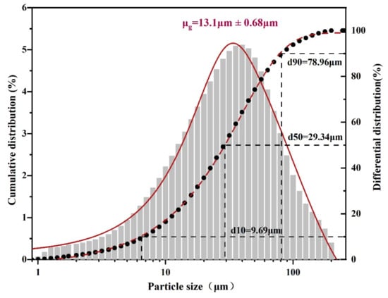 The results of the particle size analysis are shown in Figure 4. The results showed that PG particles less than 78.96, 29.34, and 9.9 μm accounted for 90, 50, and 10wt%, respectively, of the total PG particle ranging from 9 to 80 μm, belonging to the ultra-fine particle size of the PGB material.