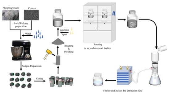 According to experience, the PGB body specimens have the highest toxicity leaching when they are maintained for 3 days []. Therefore, the solid waste leaching toxicity method (acetate buffer solution method, HJ/T 300-2007) was used to determine the extreme leaching toxicity of the backfilling body conservation for 3 days. First, the PGB body specimen was crushed, then a 100 g sample from the center part of the specimen was ground and sieved using a sieve with an average pore size of 0.045 mm. The sample and leaching agent were mixed in a 2 L polyethylene wide-mouth flask at a solid–liquid ratio of 1:20 and shaken in a fully automatic tilt shaking device (YKC-12) for 18 ± 2 h at a speed and temperature of 30 ± 2 r/min and 23 ± 2 °C. The sample was filtered through a 0.6 μm filter using a Zinten (GM-0.33A) vacuum filter pump after resting the mixture for 2 h. The filtered clear liquor was stored in bottles at 4 °C [].