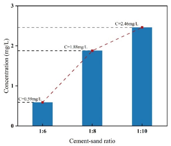 The results of the leaching toxicity experiments revealed a rapid decrease in the concentration of TP leached from PGB specimens with an increasing cement addition, as shown in Figure 6. When the cement–sand ratio was 1:6 and 1:8, the leaching concentrations of TP were 0.59 and 1.88 mg/L, which were significantly lower than the concentration of 2.46 mg/L when the cement–sand ratio was 1:10. According to the surface water environmental quality standard (GB3838-2002) promulgated by China, in order to meet the standard of centralized drinking water, the detection value of the TP concentration in these areas of rivers, lakes, and groundwater should be less than 0.2 mg/L. Phosphorus in PG exists mainly in the form of phosphate, while ordinary silicate cement mainly consists of CaO, SiO2, Fe2O3, and Al2O3. During the hydration reaction of cement, soluble phosphate reacts with Ca2+, thus adsorbing on the surface of the cement particles and retarding the hydration reaction of the cement, while forming a protective layer of calcium phosphate. Liu studied that in an acidic environment, phosphorus precipitates mainly as H3PO4, H2PO, and CaH2PO in a toxic leachate backfilling with PG, while in a neutral environment, phosphate starts to precipitate as small amounts of soluble calcium phosphate (hydroxyapatite and calcium fluorophosphate), and in an environment with an alkaline pH, the increase in Ca2+ and F+ leads to the precipitation of phosphate in the form of a dilute increased binding of soluble calcium [,,,,]. The M1, M2, and M3 groups were considered as the central sources of TP concentrations of the backfilling bodies from which TP is leached to study the diffusion transport of TP in groundwater under different leaching concentrations in the backfilling bodies.