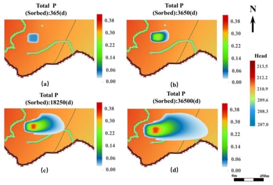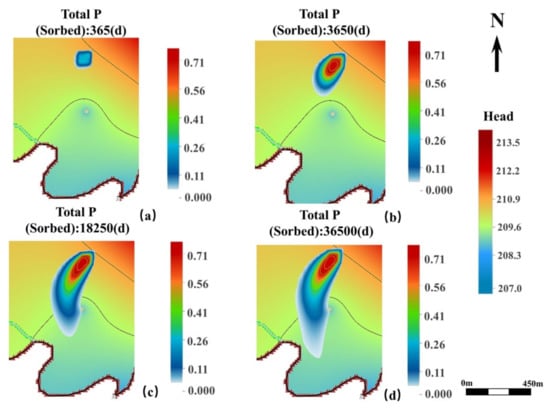 In the eastern part of the study area, the TP transport was mainly influenced by the changes in the groundwater flow field, as shown in Figure 9. The difference between the groundwater heads in the northern and southern parts of the eastern region was large, while there were two rivers in the south converge, forming a river valley. Therefore, the TP diffusion distance in the eastern part of the study area was long, while that in the eastern and western parts was short. In addition, in the eastern study area, the center TP concentration was obviously shifted gradually to the southern part with the TP transport. TP concentrations may be accumulated northward at the drainage well in the eastern part of the study area, with a flow rate of 300 m3/d, during TP in transport to the south, and then be removed from the groundwater through the drainage well.