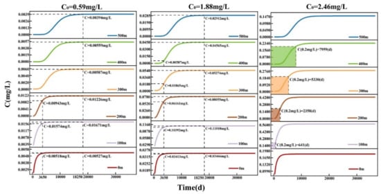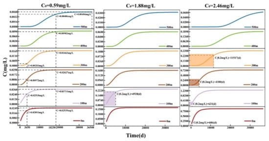 According to the spatiotemporal transport of TP at different concentrations, as shown in Figure 8, there was no exceeding the standard value of 0.2 mg/L in the study area within 500 m for 100 years at the initial source concentrations of 0.59 and 1.88 mg/L. The TP concentrations were less than the standard value of 0.2 mg/L. However, at the initial source concentrations of 2.46 mg/L, TP concentrations of 0.2 mg/L were found within 100, 200, 300, and 400 m at 641, 2358, 5330, and 7959 days, respectively, while the TP concentration within 500 m did not exceed the standard. Therefore, due to the low variation in the groundwater head in the western part of the study area, as well as the TP adsorption and attenuation, exceedances of the TP standard were observed only in the range radius of 400–500 m. In addition, the center of the pollutant concentration moved slightly downstream with an increasing distance.