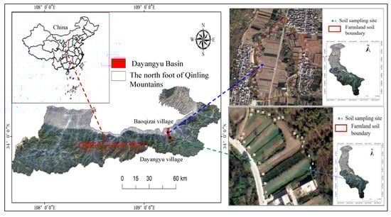 With the development of industry and agriculture, various heavy metals and organic chemicals are released into the atmosphere, hydrosphere, pedosphere, and biosphere. Heavy metals can be accumulated in organisms and consequently enriched through the food chain. Organic chemicals and heavy metal pollution can, thus, cause severe health problems in the population. The northern foot of the Qinling Mountains generally refers to the area from the north of the main ridge of the Qinling Mountains to the south of the Weihe River, which is the transition zone between the lofty mountains and the vast Guanzhong Plain. This geographical particularity makes it pivotal in protecting the Qinling Mountains [1]. The shallow mountainous area at the northern foot of the Qinling Mountains is the transitional zone between the mountain and the plain, that is, the ecotone zone between the mountain ecosystem and its adjacent plain ecosystem. The ecosystem is fragile and transitional [2]. Due to the relatively flat terrain in this area, villages are widely and densely distributed, which are greatly affected by human beings. The original natural vegetation and soil are seriously damaged, the area of barren hills and slopes is increasing yearly, and the secondary forests are distributed in disorder, which also aggravates the problem of heavy metal pollution in soil [3]. The Qinling Mountains are the boundary between the north and the south of China’s climate and represent a significant ecological security barrier. They are China’s ancestor vein and gene pool, the critical water conservation area of the Yellow River and Yangtze River basin, and China’s “central water tower”. Protecting the ecological environment of the Qinling Mountains, especially the northern foot of the Qinling Mountains, is of great and far-reaching significance to ensure the long-term prosperity and sustainable development of the Guanzhong Basin, and even the Chinese nation.