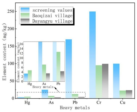 To further explore the accumulation of heavy metals in the study area, the soil background value in Shaanxi Province was selected as the evaluation standard to calculate the accumulation index of heavy metals in soil. The cumulative index evaluation results (Table 5) showed that the cumulative index of Hg in Baoqizhai Village was 3.42, an extensive pollution degree. Therefore, the accumulation of Hg was worthy of attention. On the other hand, Cr was at a none-to-moderate pollution degree, and Hg, Cr, and Cu in the soil exceeded the soil background values in Shaanxi Province. The cumulative pollution of Cr in Yangyangyu Village was the most serious, reaching light pollution, and both Cr and Cu elements exceeded the soil background values in Shaanxi Province. The cumulative index intensity of five heavy metals in Baoqizhai Village was Hg > Cr > Cu > As > Pb, and the cumulative index intensity of four heavy metals in Dayangyu Village was Cr > Cu > As > Pb.
