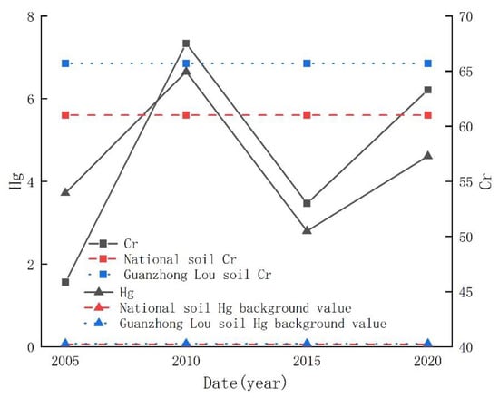In the past, some scholars investigated the heavy metal pollution of farmland soil around the Qinling Mountains. Although the study area is not entirely consistent with this paper, comparing research results in different years is conducive to the change of soil heavy metal content in the study area over time. According to the research on the heavy metal content of farmland soil around the Qinling Mountains by several scholars in 2005, 2010, 2015, and 2020 [13,14], the average content change trend of Hg and Cr in different years was drawn, as shown in Figure 4.