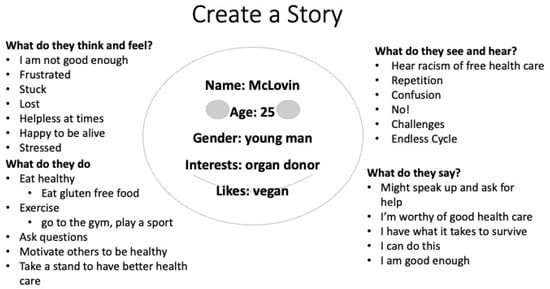 The three persona stories, Donald Duck, McLovin, and Sage, were developed collectively by participants in small groups. The personas highlighted the barriers to access mental health care. The persona stories evolved to show evidence of systemic racism in health care. Each persona story describes how Indigenous youth strive to stay healthy and thrive. Persona stories expressed how they seek help from others. Figure 1 is a representation of the empathy map created by the participants. The persona stories are shared below as collective storytelling narratives.