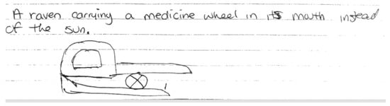 A second illustration (Figure 3) developed by participants focused on Indigenous oral traditions, specifically a creation story. The image of the Raven and the Sun depicts a creation story about how humans received the necessities of life []. The participants used an image of the Medicine Wheel instead of the sun to centre on balanced wellness as a necessity to life.
