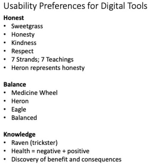 Participants generated ideas for a new interface design and layout grounded in Indigenous knowledges and cultural wellness. Usability was investigated through Indigenous storytelling and oral traditions about perceived cultural safety and inclusive of Indigenous knowledges on wellness. Figure 2 illustrates that in order to live well and have a balanced life, traditional medicines from an oral story of the Sacred Tree must be included in one’s life []. The illustration shows Sacred Tree teachings in several ways, including sweetgrass in a circle, empathy, honesty, and respect. The Sacred Tree teachings are embedded in the imagery and words chosen []. Sweetgrass is use in traditional healing ceremonies to symbolically repel negative energies and protect one’s living space, environment and self. Sweetgrass is also used for ‘smudging’ where the grass is burned and the person is encircled in the smoke that is produced. Smudging ceremonies are often part of spiritual experiences for many Indigenous groups, and are seen as a way to provide a sacred and spiritual healing experience []. Red ochre is also a believed to have protective properties and has been associated with connection with a tribe as well as the ability to protect against evil. Indeed, recent reconnection to traditional spiritual practices has identified use of red ochre for face painting as a way of “reclaiming culture” [].