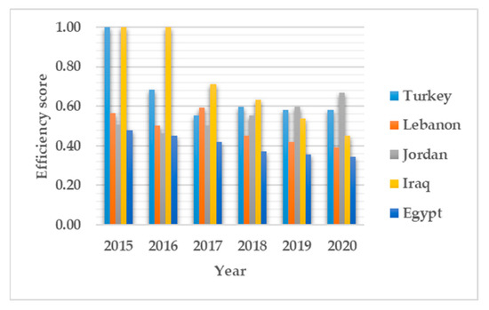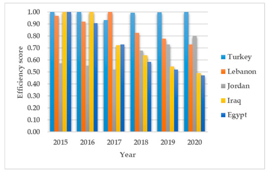 The cause of inefficiency might be unique for each country. The efficiency decomposition into pure technical efficiency and scale efficiency reveals the cause of inefficiency for each country in each period. Table 2 shows a relative decline in operational performance represented by pure technical efficiency. The average pure technical efficiency ranges between 0.71 and 0.91. In 2019 and 2020, Turkey appears to have an efficient operational refugee healthcare system. Other 3RP states performed inefficiently too. The detailed pure technical efficiency in Figure 3 shows minimal decline in the operational performance of refugee healthcare systems. Lebanon also shows a relatively high operational efficiency prior to 2018. Jordan shows hints of operational improvement in 2020 compared to other periods. Lebanon, Jordan, Iraq and Egypt show average operational efficiencies of 0.87, 0.64, 0.73 and 0.70, respectively, compared to Turkey’s 0.99. Turkey’s high operational efficiency across the evaluated period signifies that lessons can be learned by other 3RP states from Turkey’s operational practices. The scale efficiency (Figure 4) that represents the optimal use of existing capacity shows Iraq to be most efficient. Turkey on the other hand, shows a high scale inefficiency score with an average of 0.68 in 2020 when compared to its 2015 SE score. Iraq and Jordan attained high SE efficiency scores of 0.99 and 0.91, respectively.