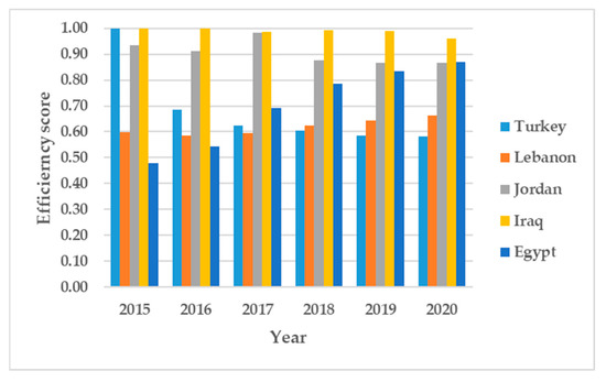 As per the DEA efficiency analysis and model (1), an efficiency score of one indicates a relatively efficient performance in that period, and less than one signifies an inefficient performance. The refugee healthcare efficiency in this context represents the adequate healthcare services provided for refugees given the available resources of trained personnel and health expenditure. Table 2 presents the descriptive statistics of the efficiency for the evaluated period. The result shows absence of uniformity in refugee healthcare provision in Turkey and other 3RP states. The overall efficiency score is a combination of both operational and capacity utilization of the healthcare system. The average overall efficiency continues to decline over the evaluated period. Results for all 3RP states show a 13% decrease in overall efficiency between 2015 and 2020. This indicates a gross underperformance of refugee healthcare services over time. Figure 2 illustrates the detailed overall efficiency by each country. In 2015, Turkey and Iraq performed efficiently. Only Iraq performed efficiently in 2016, and Egypt was consistently the least efficient country overall. The performance of Lebanon and Jordan was relatively consistent, though inefficient. In 2020, Jordan had an efficiency score of 0.67, the maximum in that period. Though the standard deviation continuous to decrease overtime, the overall inefficiency is alarming.